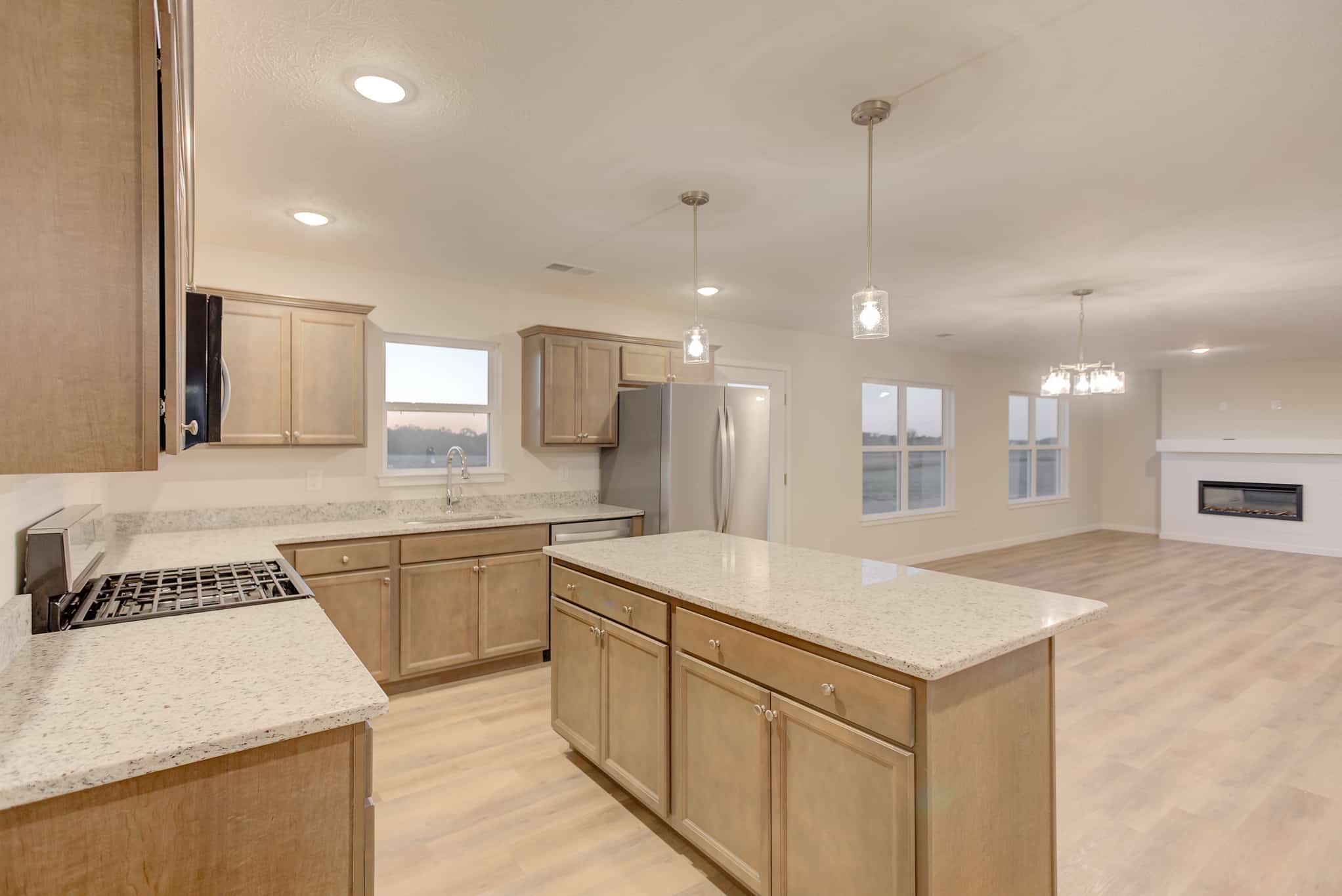This 2305 sqft Blue Jay floor plan with 4 bedrooms and 3 baths has been upgraded to include a 6×24 covered front porch, 12×24 back patio and 24×24 2-car garage. The single level home offers an open floor plan with living room, kitchen with island and walk-in pantry, dining room and family room with a beautiful gas fireplace and large laundry room. The master suite features a bathroom with a tiled drop-in tub, shower and walk-in closet. See below for additional selection details!